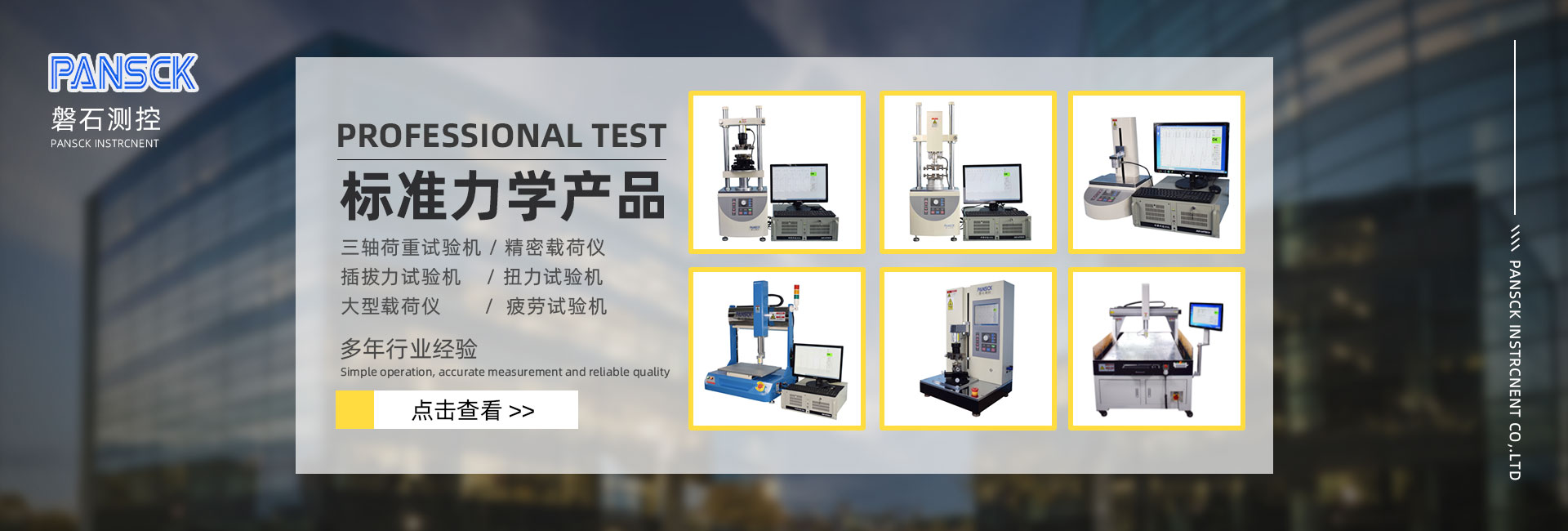 磐石測控主要產品有:荷重位移曲線機、快速按鍵力測試機(專為產線檢測研發)、三軸荷重位移曲線機、插拔力試驗機(立式/橫向/多工位)、扭力試驗機、轉軸扭力試驗機、快速扭力測試機(專為產線檢測研發)、三軸扭力試驗機、精密彈簧拉壓力試驗機、精密醫療微力試驗機、伺服壓機、非標定制、力量傳感器、軟件及控制卡等。